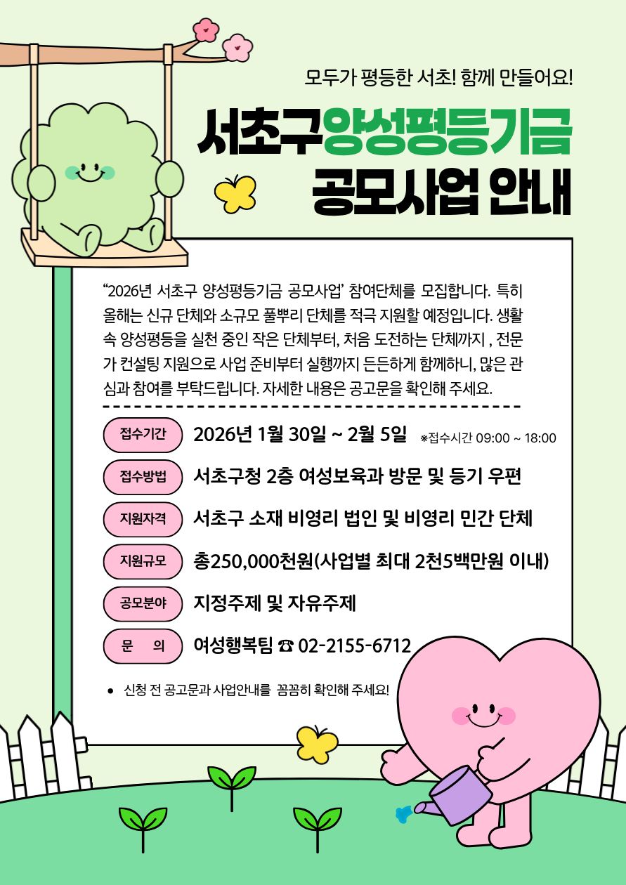 ‘2026년 서초구 양성평등기금 공모사업’ 참여단체를 모집합니다.