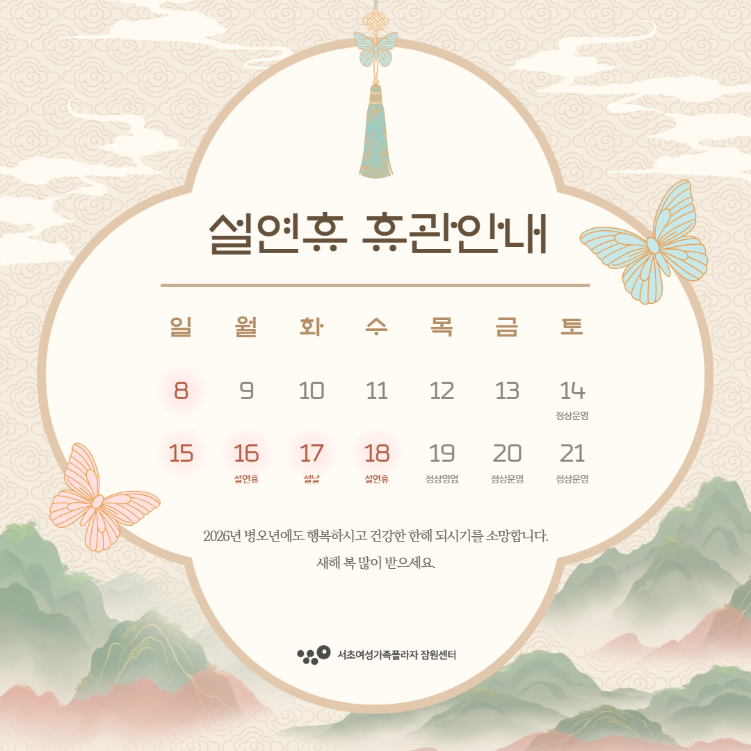 설 연휴 기간동안 센터 운영이 아래와 같이 휴관되오니 이용에 참고 부탁드립니다.