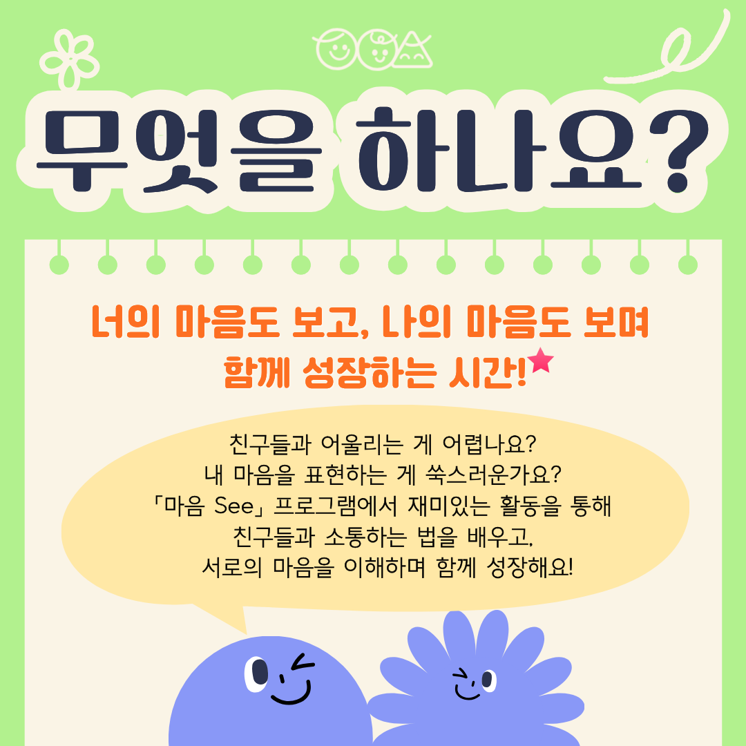 「마음 See」 프로그램에서 재미있는 활동을 통해 친구들과 소통하는 법을 배우고, 서로의 마음을 이해하며 함께 성장해요!