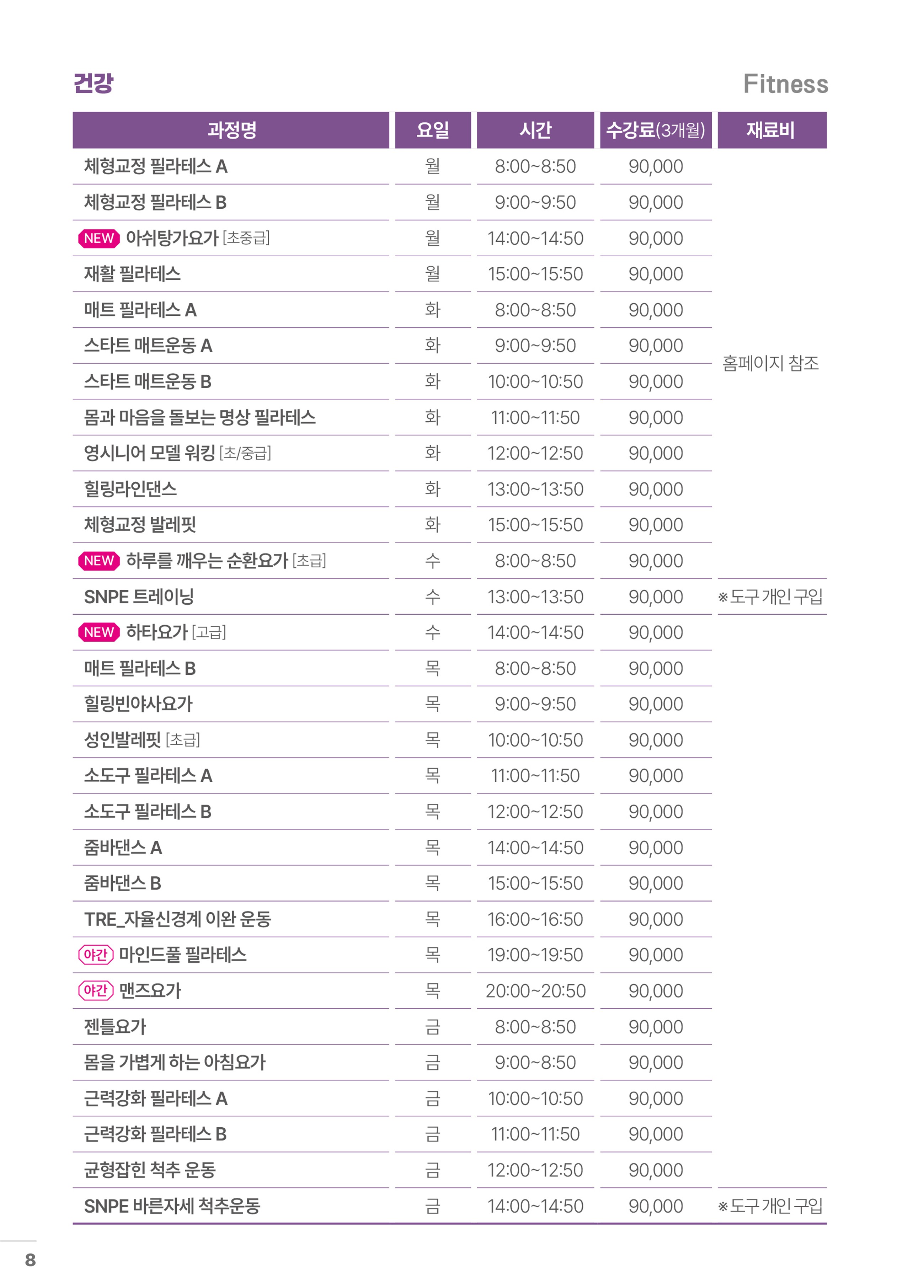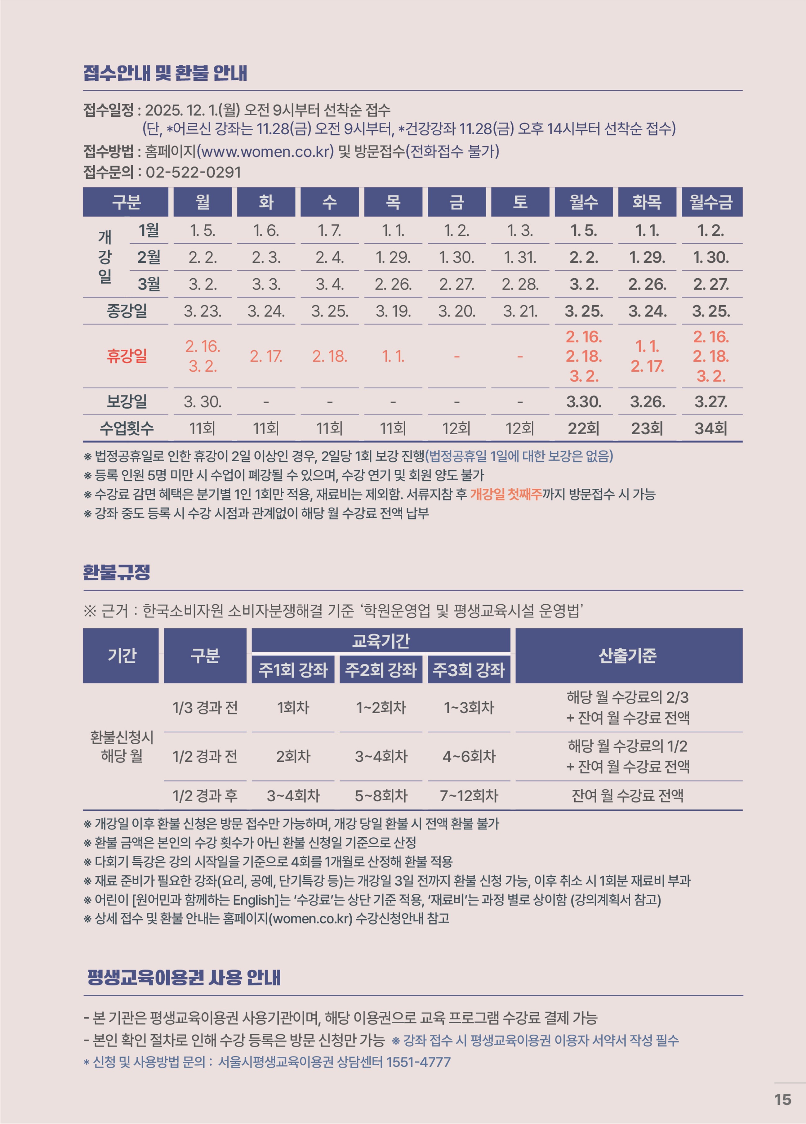 ※ 많은 이용자의 동시 접속으로 인한 시스템 오류를 최소화하기 위하여, 이번 분기 건강강좌(운동강좌)는 별도 일정으로 접수를 진행합니다. 접수 시 참고하여 주시기 바랍니다. ※ 어르신/건강 외 모든 강좌는 12/1(월) 9시부터 접수 진행합니다. |
